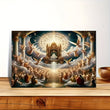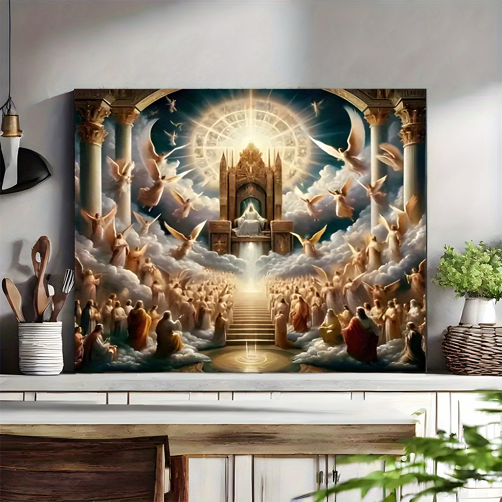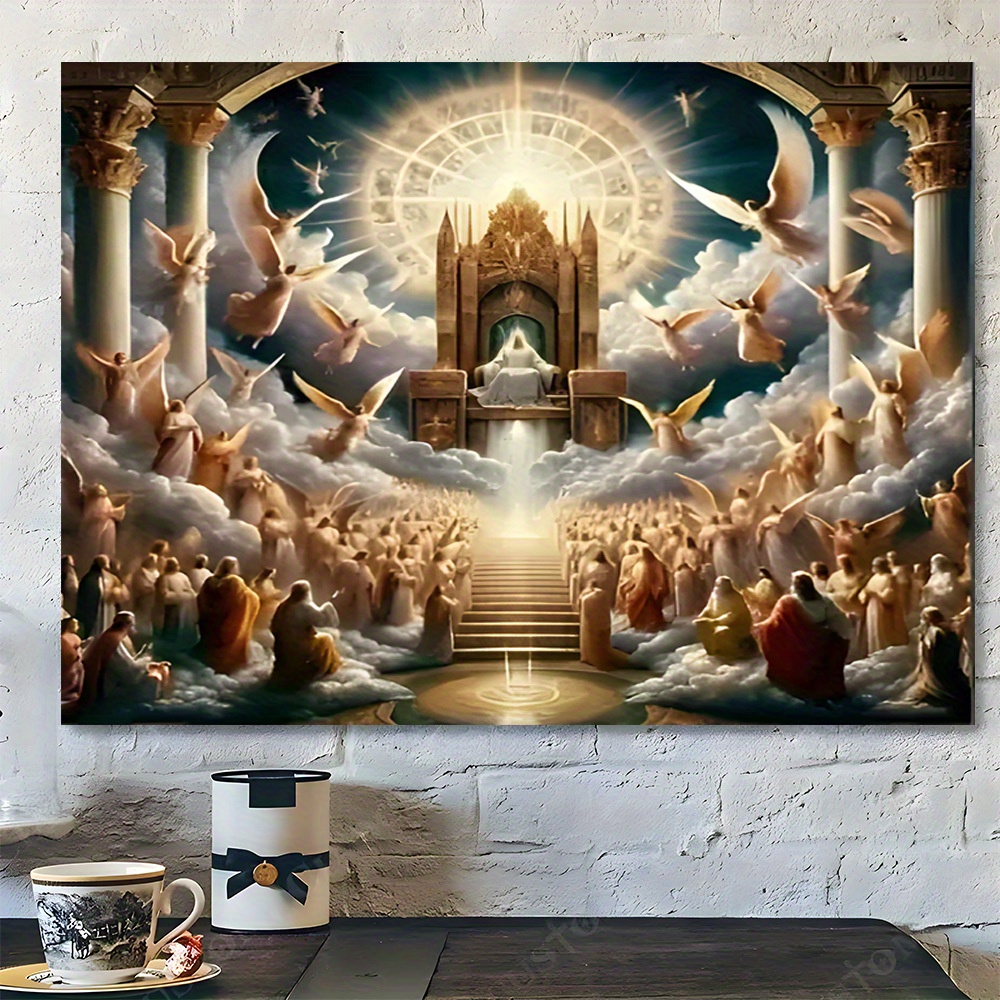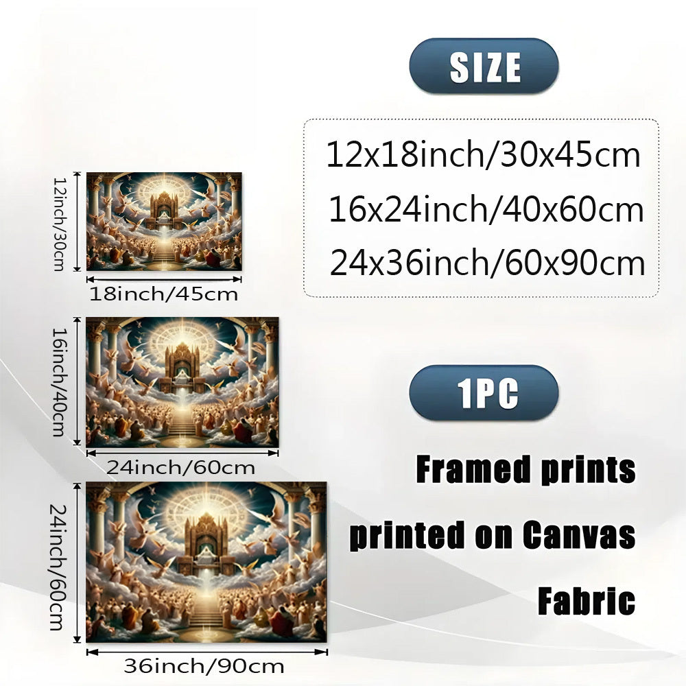 Elevate your space with the Heavenly Throne and Angels Canvas Print, featuring a divine light and celestial scene expertly rendered on a wrapped canvas. Encased in a sturdy pine wood frame, this artwork brings a serene, ethereal atmosphere suitable for home, office, bar, or cafe settings. Its fashion-inspired theme complements festive environments perfectly, making it an ideal choice for Christmas decoration. This single framed piece offers timeless elegance and spiritual beauty to enhance any interior with refined sophistication.